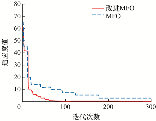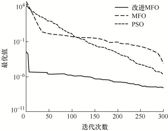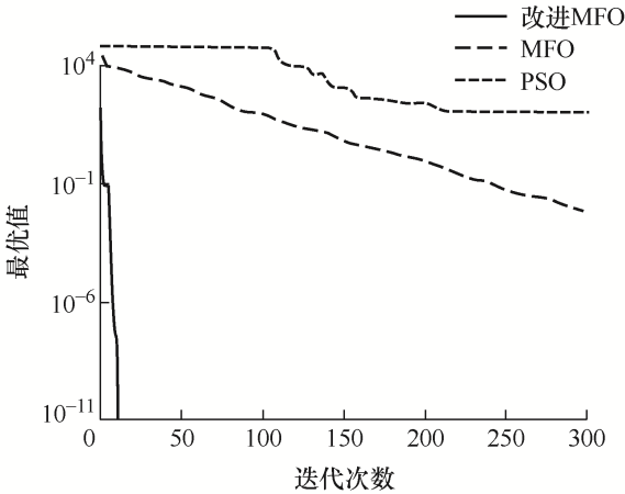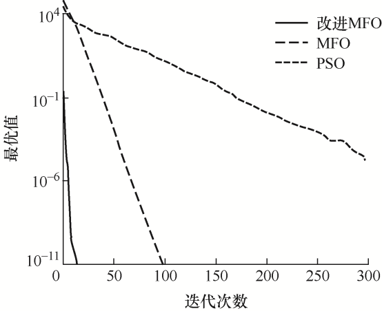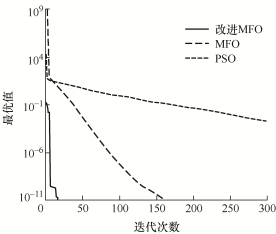 f 1 和f 3 函数仅有全局最小点,改进MFO算法相比其他算法有较高的收敛精度和速度。f 2 和f 4 函数具有多个极小值,可以看出改进MFO算法能跳出局部最优,收敛到全局最小值。