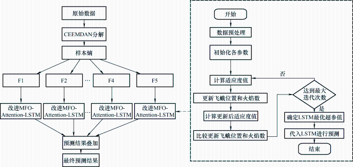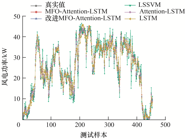 鉴于以上研究,本文提出了改进飞蛾扑火算法(Moth-flame optimization,MFO)优化Attention- LSTM的超短期风电功率预测模型。首先,通过CEEMDAN算法将原始数据分解成不同的模态分量,通过计算样本熵合并相近的IMF分量来降低计算规模。然后,通过对飞蛾扑火算法进行改进,用改进的MFO算法对Attention-LSTM的超参数进行优化。最后,用改进MFO优化Attention-LSTM对合并后的各新分量分别进行预测,将各个分量的单独预测结果进行叠加,可以得到最终的超短期功率预测结果。预测结果表明,该方法相比单一LSSVM、LSTM、Attention-LSTM、MFO-Attention-LSTM等模型具有更好的预测效果,提升了功率预测的准确度。