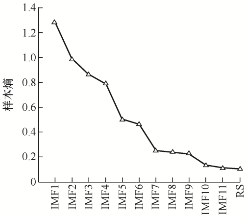 ... 然后计算各分量的样本熵,由式(10)、(11)可以看出,样本熵值受m 、r 大小的影响.由研究结果可知[22 ] ,m= 1或2,r =0.1Sd ~0.25Sd 时得到的样本熵较合理且经过多次试验,本文中取m =2,r =0.2Sd .CEEMDAN分解的各分量样本熵如图13 所示. ...