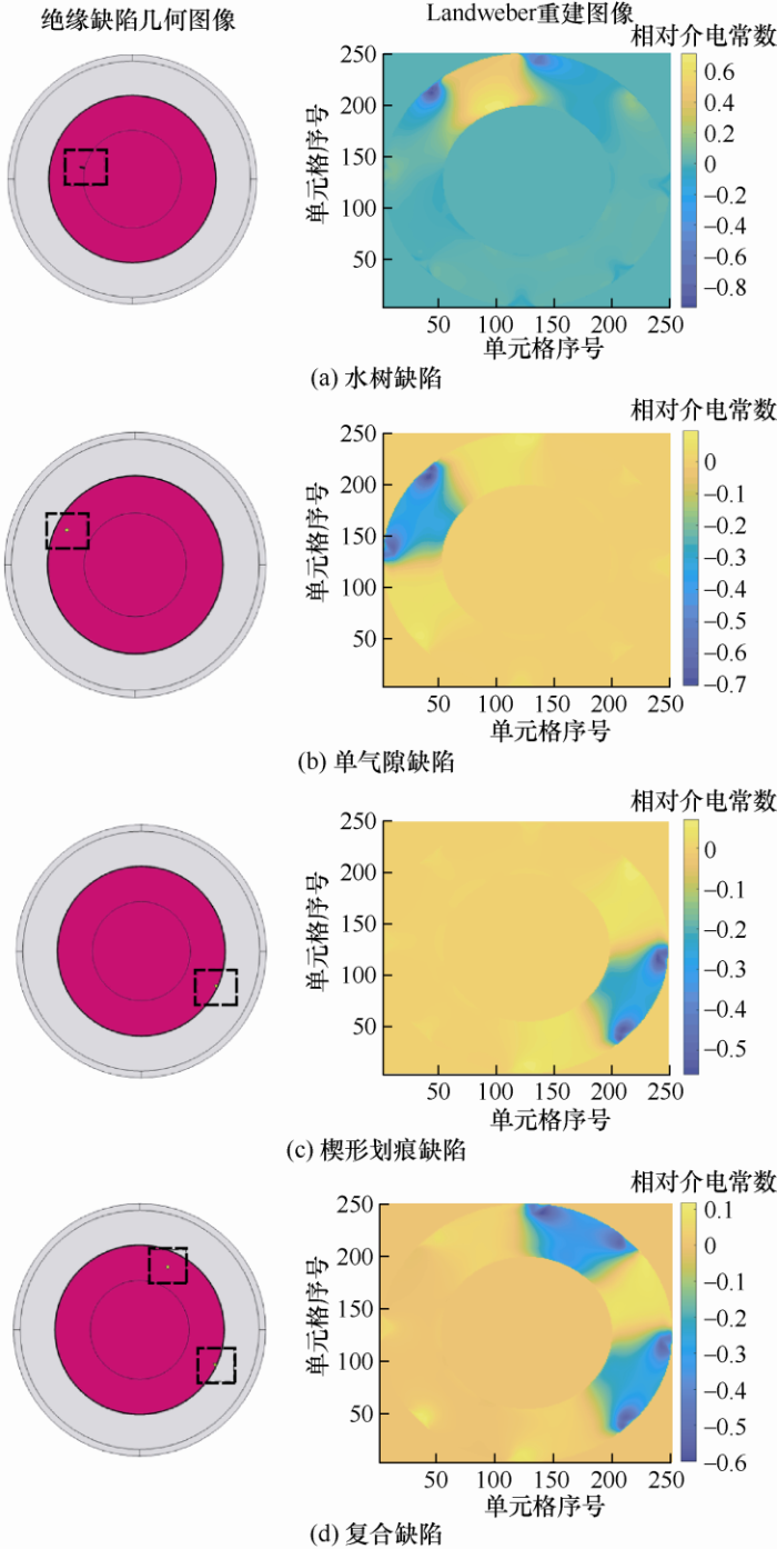 XLPE电缆绝缘缺陷仿真设计了绝缘层的气隙缺陷、水树缺陷、楔形划痕缺陷和复合缺陷共4种典型缺陷,采用Landweber迭代算法重构电缆内部绝缘缺陷的分布图像并分析成像质量。