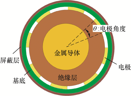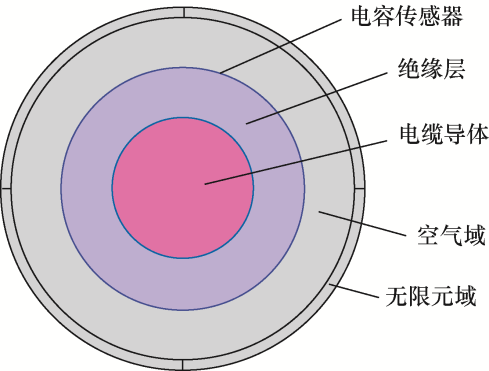 以某交联聚乙烯电力电缆为研究对象,利用COMSOL Multiphysics完成八电极电容传感器和电缆二维仿真模型的搭建和电容值的计算,具体的仿真参数如表1 所示,仿真模型如图2 所示。