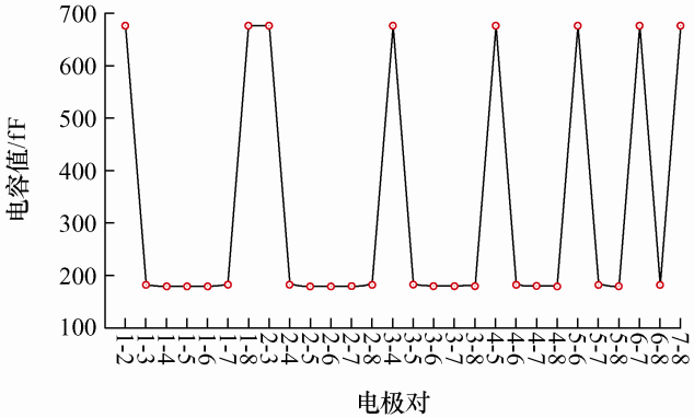 图3 所示电容传感器电极之间测量的电容值在180~676 fF,相邻电极与非相邻电极的电容值差值在3.8倍,电容值呈对称分布。