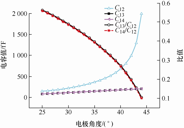 利用建立的电容传感器和电缆仿真模型,修改传感器的电极角度,计算传感器电极角度与信号强度即电容值的关系,以及传感器电极角度与相邻电极电容值和非相邻电极电容值的比值,仿真结果图5 所示。非相邻电极如电极1和电极3之间的电容C 13 与电极角度是成正比的,相邻电极1和电极2之间的电容C 12 与电极角度的关系曲线是开口向上的抛物线,这说明传感器电极角度越大,电容值也越大,其中相邻电极的电容值对电极角度的变化更加敏感。