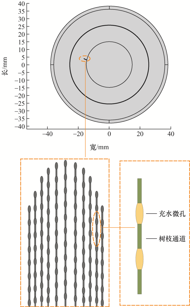水树缺陷模型中,水树采用椭球结构模拟水树真实的介电常数变化[23 ] ,如图8 的水树缺陷模型示意图所示。椭球结构是由一系列充水微孔和树枝通道交替链接组成的,其中充水微孔是长半轴为5 μm,短半轴为3 μm的不完整椭圆,相对介电常数为81,树枝通道是宽度为3 μm,长度为10 μm的矩形,相对介电常数为4.6,模型中的水树为内导型水树,起始于导体和绝缘层的交界处向护套层延伸,长度为2 mm。