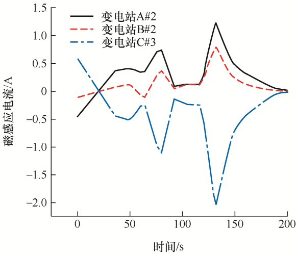 目前国内外对于变压器直流限值尚无定论,对于额定电流为I N 的三相变压器,导则[21 ] 规定直流偏磁时每相绕组的I DC 应小于0.7%I N ,算例区域内变电站中变压器额定容量均为240 MW,额定电流为630 A,则直流偏磁时每相绕组的I DC <4.41 A。基于该规范,变电站A#2的感应电流占直流偏磁限值的27.89%;变电站B#2的占比为17.91%;变电站C#3的占比为46.03%。算例中B变电站距离地铁线路最近,但磁耦合影响相对A、C两变电站没那么严重。由此推测,感应电流的流向一般是从靠近地铁的一侧流向远处接地变压器。