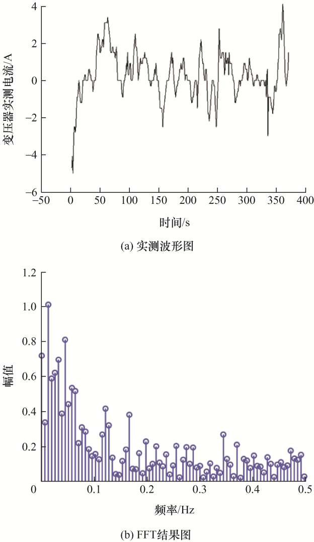 图10a 为变电站A#2号变压器实测波形结果,图10b 为频域分析结果。图10 中感应电流直流分量占比为4.56%,感应电流以0~0.1 Hz频率分量幅值占比为主。