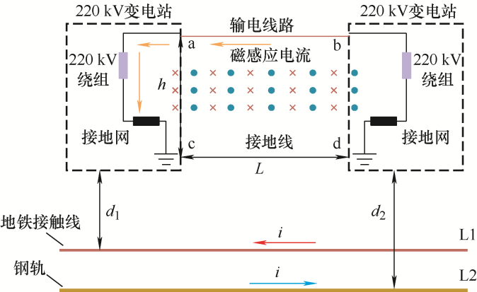 地铁牵引供电回路主要由接触网和回流轨构成,接触网悬挂线直径为毫米级,悬挂线和回流轨的直线长度远大于两变电站之间的距离,且机车运行对磁场分布的影响较小,因此分析时用两条无限长的平行载流导线等效地铁牵引接触网系统。以最简单的电网单回路与地铁线路处于同一平行平面时进行分析(图3 ),图3 中L1、L2分别表示接触网和回流轨,L1产生垂直纸面向里的磁场,L2产生垂直纸面向外的磁场;i 为忽略杂散电流情况下接触网和回流轨流过的瞬时电流;电网输电线路与大地形成的闭合回路abcd中,h 为回路高度,L 为回路并行长度,d 1 、d 2 分别为接触线和回流轨与电网回路的最近距离。