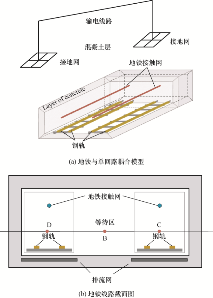 有学者在针对地铁牵引电流变化产生的交变磁场的研究中提出,该磁场可能会耦合电网回路产生感应电流,即所谓的磁耦合机制,然而此研究仅通过试验监测发现地铁上方的导线回路中存在感应电流,与实际电网回路存在一定差距,并未深入研究磁感应电流特性[9 ] 。因此,为深入探究地铁与电网回路磁耦合机制,探明感应电流对电网回路的影响情况,本文搭建地铁与电网回路耦合仿真模型和电网数值分析模型,计算分析感应电流在电网回路中的分布特点。