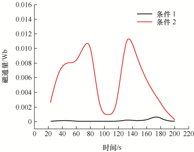 工程实际中,地铁线路大多处于地下,电网架空输电线路都处于地上,因而两者在空间中存在重叠、交错等多重情况。本文主要分析两种典型情况:① 电网输电回路全部处于地铁线路的某一侧;② 地铁线路在空间上穿越电网输电回路。为方便进行对比,本文设置地铁线路与电网回路最近距离为定值(4 000 m),此时电网回路中磁通量情况如图5 所示。当地铁线路与电网回路距离相同时,地铁线路在空间上穿越电网回路情况下产生的磁通量更大,由此产生的感应电流幅值上最大可达0.19 A。由此说明,对于穿越电网回路的地铁线路,不论其与电网回路的距离远近,对于电网的磁耦合影响都不可忽略。