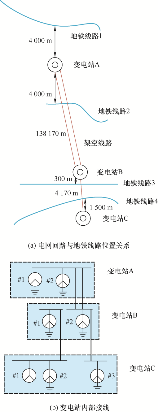 某区域内A、B、C三座变电站与周边地铁线路位置关系如图6a 所示。图6b 为变电站内部接线情况。由于输电线路必须依靠变压器中性点的接地,电流通过变压器的绕组,形成导通电流回路,而一次高压侧与二次低压侧不存在电路上的连接,所以只考虑一次侧的星形连接的电路模型。