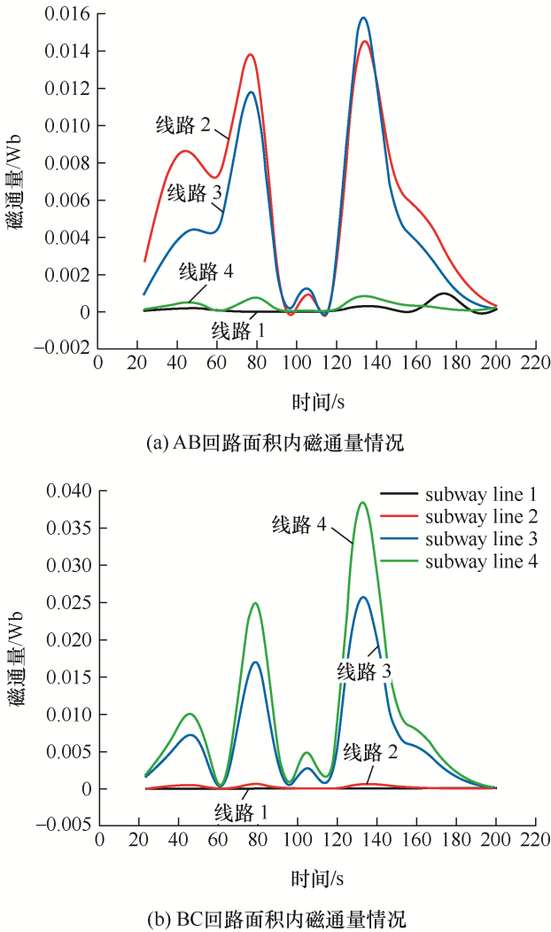 (1) 若地铁线路与电网回路不存在空间上的交错,则随着两者距离的增大,回路磁通量和感应电流不断减少。若地铁线路在空间上穿越电网回路,则不论其与变电站距离远近,回路中感应电流均不可忽略。