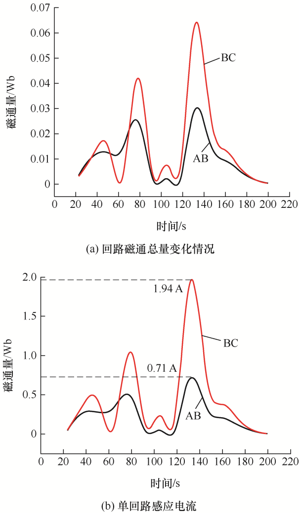在区域空间内,地铁线路1未穿越任何电网回路;线路2穿越AB回路;线路3和4穿越BC回路。各个地铁线路对电网单回路磁耦合影响下,回路面积内磁通量的仿真结果如图7 所示。图7 中AB回路主要受地铁线路2和3的影响,BC回路主要受地铁线路3和4影响;地铁线路1对两个单回路的影响都不大,基本可以忽略。基于此,计算各单回路内的磁通总量变化及感应电流情况如图8 所示。图8 中AB和BC回路的感应电流幅值最大分别为1.94 A、0.71 A。