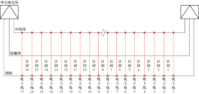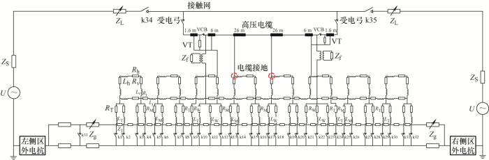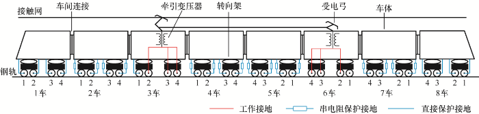目前,国内外学者对接地回流的研究主要集中在接地回流幅值和相位的研究[5]。千岛伸雄等[6]对动车组的车体参数进行了测试,并且通过仿真分析发现在接地装置上串联0.5 Ω的电阻器可以有效地抑制动车组的接地回流,但是该方法的弊端是会引起车体电位的抬升。文献[7-8]发现靠近工作接地点的保护接地回流最大,取消保护接地点可以有效抑制接地回流,增加变压器的工作接地点可以有效抑制各车轴的工作接地电流。文献[9⇓⇓-12]建立了动车组接地系统的电路仿真模型,通过仿真分析发现钢轨上的牵引电流会从距离工作接地点最近的保护接地线上流入车体,最后由头、尾车的保护接地线流向钢轨,并且提出了动车组接地系统的优化方案。文献[13⇓⇓-16]建立了直接供电方式与AT供电方式下动车组过吸上线动态过程模型,着重分析了动车组在过吸上线区间时接地电流的动态变化规律,从接地电流的幅值和相位两个方面揭示了接地回流的分布特性。文献[17⇓⇓-20]建立了动车组过吸上线、过绝缘节接地系统的等效模型,分析了编组形式、运营线路、运营列车共臂等因素对动车组接地回流造成的影响。