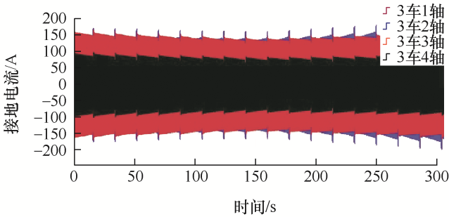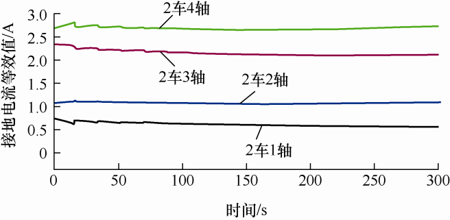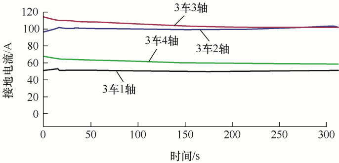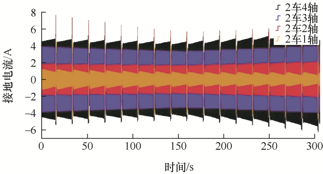 图8显示了市域列车在供电区段内正常行驶时,2车1~4轴的保护接地电流波形变化呈周期性变化,总体趋势是先减小后增大。2车的保护接地回流变化与3车的工作接地电流趋势相似,因为3车初始时刻接地电流较大,导致从2车流回车体的电流也较大;随着3车接地电流减小,2车的接地回流也减小;反之,随着3车接地电流增大,2车的接地回流也增加。