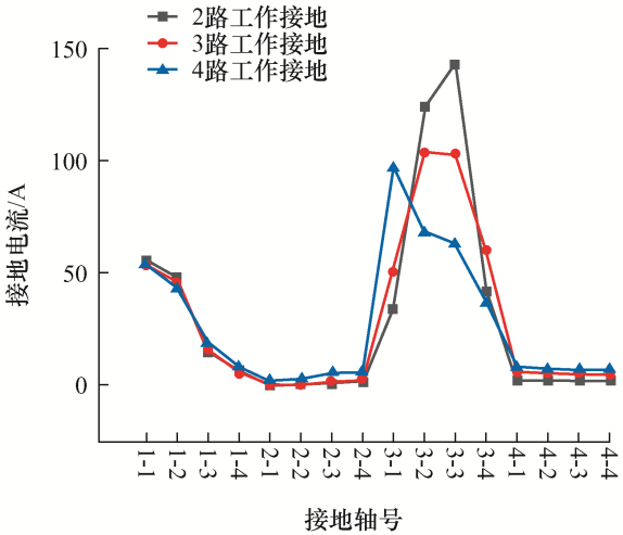 从图13可以看出,在2路工作接地方式下,市域列车3车2轴与3车3轴接地电流等效值处于较高水平,虽然工作接地电流在两轴之间分布较为平均,但是由于接地电流过大,会导致市域列车的接地碳刷磨损加剧,大大减少了接地碳刷的使用寿命。在采用3路工作接地方式下,市域列车2轴、3轴工作接地电流等效值分布较为平均,4轴工作接地电流等效值相对较小,3路工作接地方式接地电流等效值明显下降,对接地碳刷的影响相有明显的改善,但是工作接地电流仍然存在分布不均的现象。相比于3路工作接地,当工作接地设置为4路时接地电流等效值明显降低,并且当市域列车4路工作接地时接地电流的分布也更加均匀。