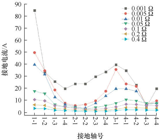 (2) 相较于2路和3路工作接地,4路工作接地方式电流等效值更小,并且接地电流分布更加均匀。在每个保护接地都采用串联接地电阻器方式时,增大接地电阻器阻值,能够有效抑制接地电流的等效值,同时使各轴接地电流分布更加均匀。保护接地电阻器的阻值的范围建议设置在0.03~0.1 Ω。
