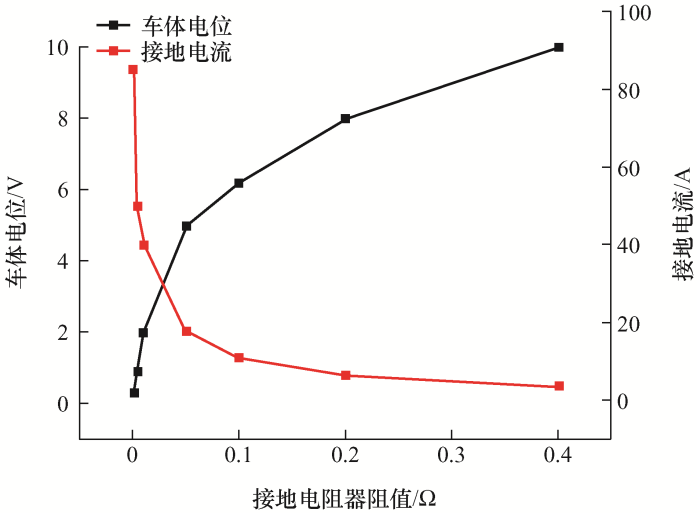 由图15可知,当接地电阻器的阻值在0.03~0.1 Ω时,市域列车的接地电流与车体电位都处于较小的数量级,所以,保护接地电阻器的阻值的范围应在0.03~0.1 Ω。