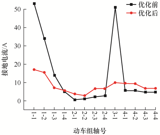 将市域列车三路工作接地方式改为4路工作接地方式,将3车2、3、4轴、6车2、3、4轴、2车4轴、7车4轴设置为工作接地,所有保护接地均串联接地电阻器,接地电阻器阻值全部设置为0.05 Ω。