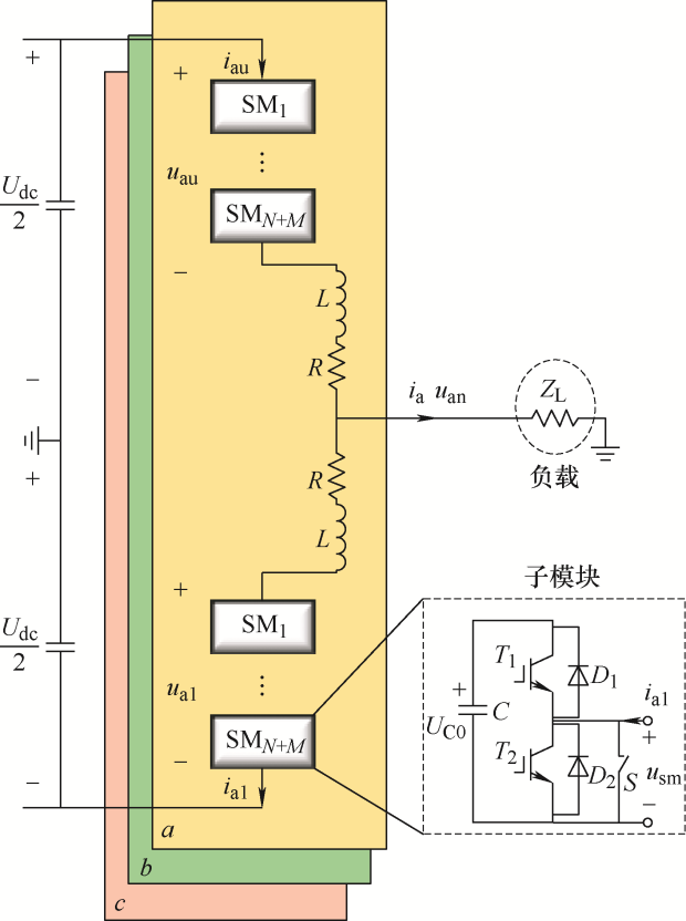 当模块化多电平换流器(Modular multilevel converter,MMC)子模块个数较多时,采用最近电平逼近调制(Nearest-level modulation,NLM)能够降低谐波含量、减小运行损耗。因此基于NLM的MMC被广泛应用于柔性直流输电、清洁能源并网输送以及动态无功补偿等领域[1-2]。子模块(Sub-module,SM)故障是MMC的一种常见故障,为降低子模块故障导致MMC退出运行的风险,其桥臂通常配备了冗余子模块。根据冗余子模块电容是否充电,可分为热备用子模块(Hot-reserved SM,HRSM)与冷备用子模块(Cold-reserved SM,CRSM)。