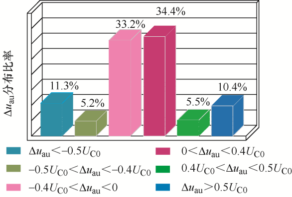 式中,Saui为第i个子模块的开关函数,Saui等于0或1,分别表示该子模块为切除或投入状态;uaui为第i个子模块电容电压。为便于阐述,设被充电的CRSM为CRSM1,其上、下IGBT开关信号分别为Sup、Slow,桥臂电流为iau,其正方向为注入子模块方向。为直观展示Δuau分布情况,图4分为六个区间对Δuau分布比率进行了统计。