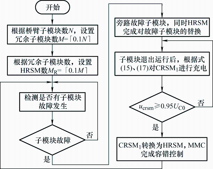 根据第2.2节分析,若MMC子模块在CRSM充电过程中,故障子模块数量超过HRSM数量则MMC无法实现平滑的容错控制。因此本文提出的策略中,将10%的冗余子模块设置为HRSM,其余冗余子模块则设置为CRSM,可得HRSM数量表达式如下