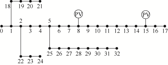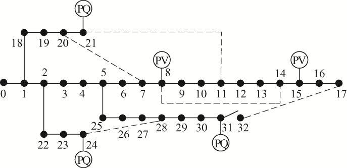 本文在Matlab环境下对所提方法进行仿真验证。使用IEEE-33算例系统模拟实际中压配电网,以线路31-32断开,联络线17-32投入为例进行拓扑结构辨识验证,如图9所示。