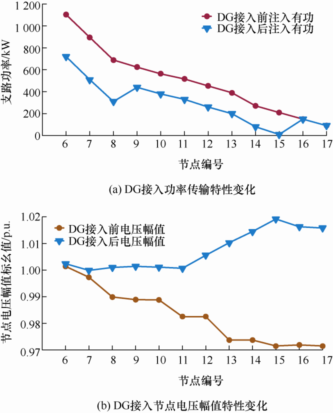 分布式电源的接入改变了配电网的节点电压幅值特性。分布式电源的接入抬升了节点电压,使得接入节点的电压幅值可能高于附近节点的电压幅值,此时节点电压幅值将不再遵循沿配电线路递减的特性。