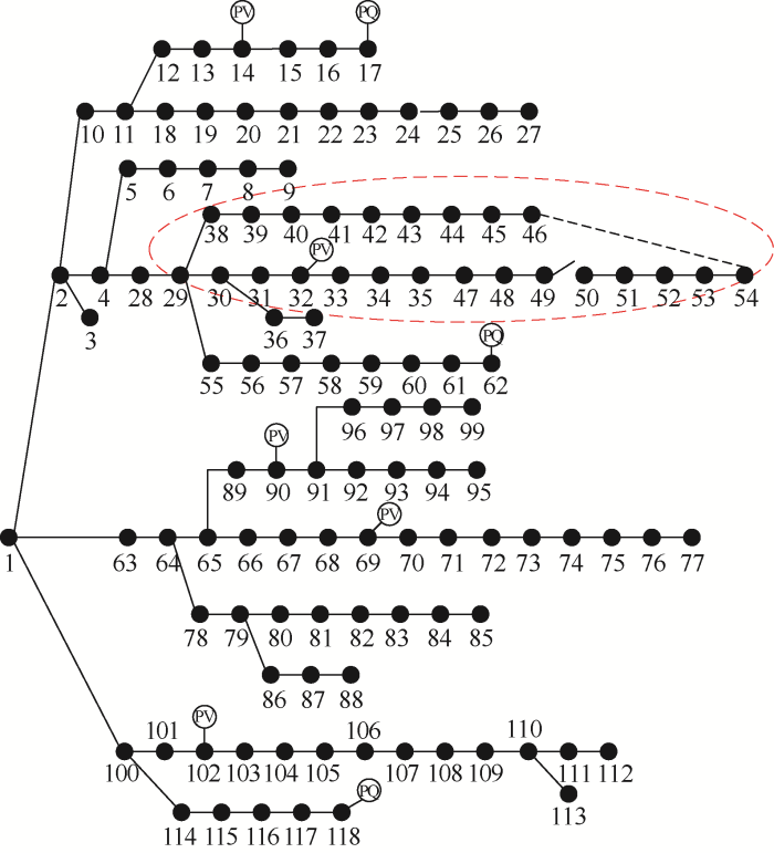 为了验证拓扑辨识方法对于不同配电系统的适应性,使用IEEE-118算例系统,以线路49-50断开,联络线46-54投入为例进行方法适应性分析,IEEE-118算例系统如图13所示。