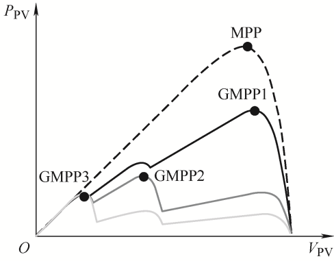 太阳能是绿色可再生能源,光伏发电作为太阳能开发利用的典型方式受到了世界各国研究人员的普遍关注。然而,在现有技术条件下光伏电池的光电转换效率不高,并且输出呈现非线性[1⇓-3],为有效提高光伏阵列发电效率,需要采用最大功率点跟踪(Maximum power point tracking,MPPT)控制技术使其工作在最大功率点处。实现全局最大功率跟踪(Global maximum power point tracking,GMPPT)是提高光伏发电系统工作效率的基本措施[4⇓-6]。理想环境条件下,光伏阵列功率-电压(P-U)特性曲线呈现单峰值特征,采用传统的MPPT控制方法(如扰动观察法、电导增量法等)即可实现最大功率跟踪控制。但在实际工作过程中,光伏电池会因为光照不均匀、积尘覆盖、老化等原因,使得光伏阵列的电流-电压(I-U)特性曲线呈现阶梯状,同时其功率-电压(P-U)特性曲线具有多个峰值[7]。在多峰值情况下,传统最大功率跟踪控制方法无法准确搜索到全局最大功率点(Global maximum power point,GMPP),易收敛于局部最大功率点(Local maximum power point,LMPP),从而导致跟踪失败,使得光伏阵列工作效率降低,输出功率显著减小[8]。
