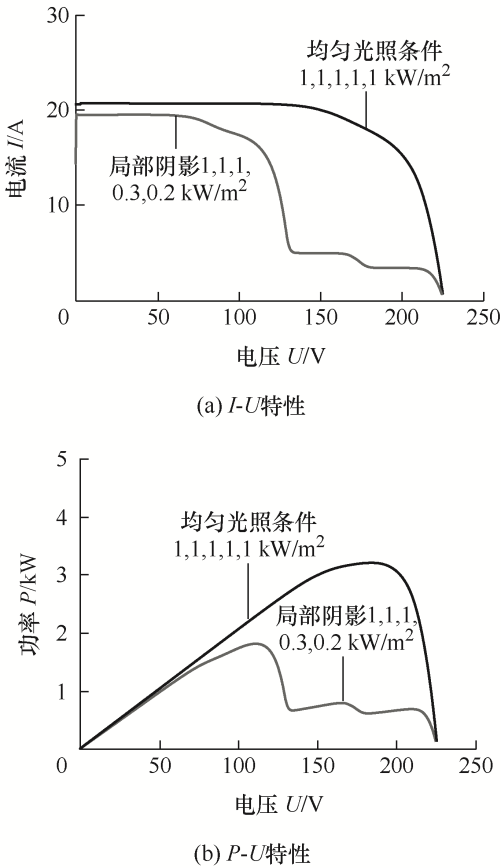 仿真模型中光伏阵列特性曲线,如图8所示,包括均匀光照条件(S=1,1,1,1,1 kW/m2)和局部阴影条件(S=1,1,1,0.3,0.2 kW/m2)两种情况。