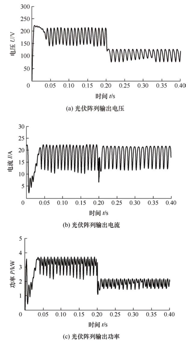 如图3所示,在全局最大功率点坐落于光伏阵列输出电压较高区域的情况下,当光照均匀时,光伏阵列工作点位于A点,当有局部阴影产生后,其工作点迅速移动到B点。本文所提算法经式(6)、(7)判断得知有局部阴影产生,然后利用式(8)对光伏阵列最大功率点所处的位置区域进行初步定位,令Ipv(k)=IB,得UC=Uref=Zr×IB,从而可根据新的参考电压UC将工作点从B点移至C点,最后再利用扰动观察法对全局最大功率点进行准确跟踪,使工作点最终稳定在全局最大功率点D点附近。此种情况对所提控制方法最为不利,因为全局最大功率点D坐落在初始功率点B附近,而算法根据式(8)对光伏阵列最大功率点所处的位置区域进行初步定位得到的工作点C距离全局最大功率点相对较远。