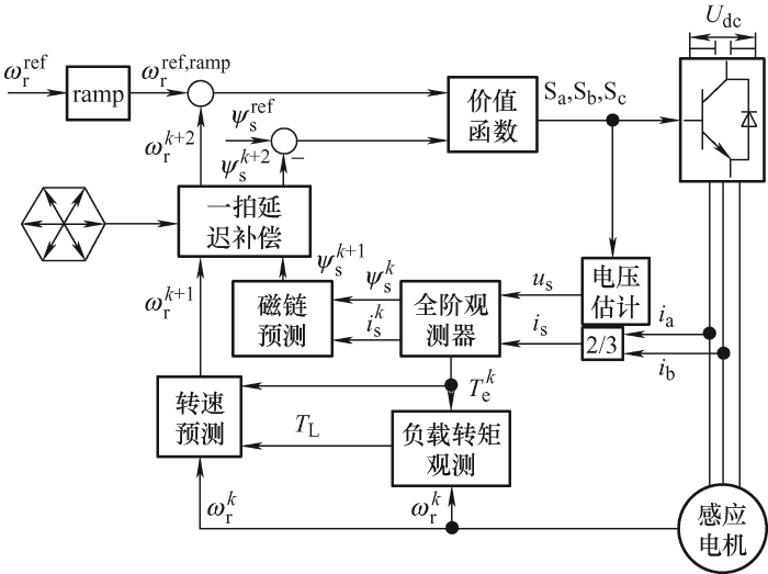 MPDSC的整体控制框图如图1 所示。下面将从磁链观测、转矩和磁链预测、负载转矩观测和转速预测、价值函数和矢量选择等四方面对图1 做简要说明。