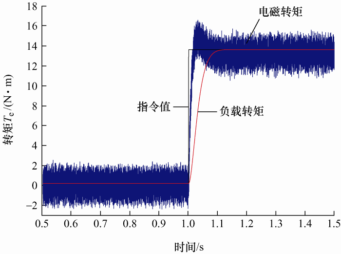 通过仿真对构建的负载转矩观测器进行验证,使用的电机参数如表1 所示,在电机稳态运行至1 s时突加额定负载13.5 N·m,仿真结果如图2 所示。图2 中指令值为所加载的实际转矩,电磁转矩根据定子电流和电子磁链计算获得,负载转矩为负载转矩观测器观测得到的波形。由图2 可以看出,观测的负载转矩很快收敛到实际负载转矩且波动较小。与此同时,由于闭环控制的作用,电磁转矩响应迅速,在实际负载变化后迅速增加并与之平衡,使系统达到稳态。