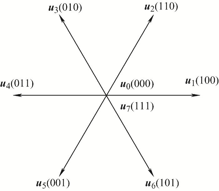 两电平电压源型逆变器一共有7种不同的基本电压矢量,如图3 所示。首先,根据式(5)、式(9)对7种电压矢量作用下的定子磁链$\mathbf{\psi }_{si}^{k+1}$ 和转速$\omega _{\text{r}i}^{k\text{+1}}$ 进行预测$(i=0,1,\cdot \cdot \cdot,6)$ ;再根据预测值计算相应的价值函数值;最后,根据最小化价值函数的原则选取最优电压矢量由逆变器输出。