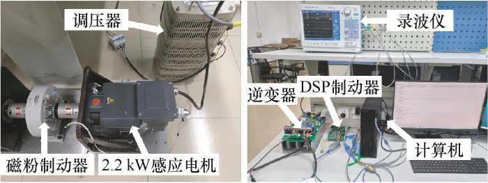为验证所提方法的有效性,本文对MPTC和MPDSC在两电平交流调速试验平台进行了试验验证,并对两种方法所得的试验结果进行了对比,所用到的电机参数如表1 所示。试验中所用的2.2 kW感应电机机组、驱动电路和控制电路如图4 所示。在试验中通过调节磁粉制动器电流的大小来提供负载转矩,直流母线电压为540 V。采用DSP TMS320F28335来运行核心控制算法部分,试验结果图5 ~8 中所示的四个通道从上到下分别为转子转速、电磁转矩、定子磁链和定子相电流。除定子相电流是直接由电流探头直接测量得到外,其余三个通道均由控制板扩展DA通道输出到DL950录波仪中显示。