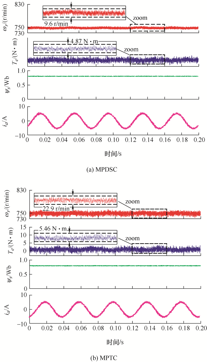 在三种转速下可以发现MPDSC的转速、转矩脉动均小于MPTC,这是因为MPDSC的价值函数直接对转速进行控制,更加精确。而MPTC的价值函数是对电磁转矩进行控制,电机在运行过程中参数可能会发生变化,由电磁转矩到转速的转化会受到电机参数的影响。同时MPTC要通过调节PI参数获得与MPDSC相同的动态响应,也会导致稳态性能稍差。由此说明了所提MPDSC的有效性。