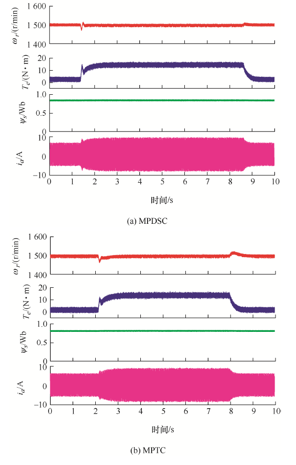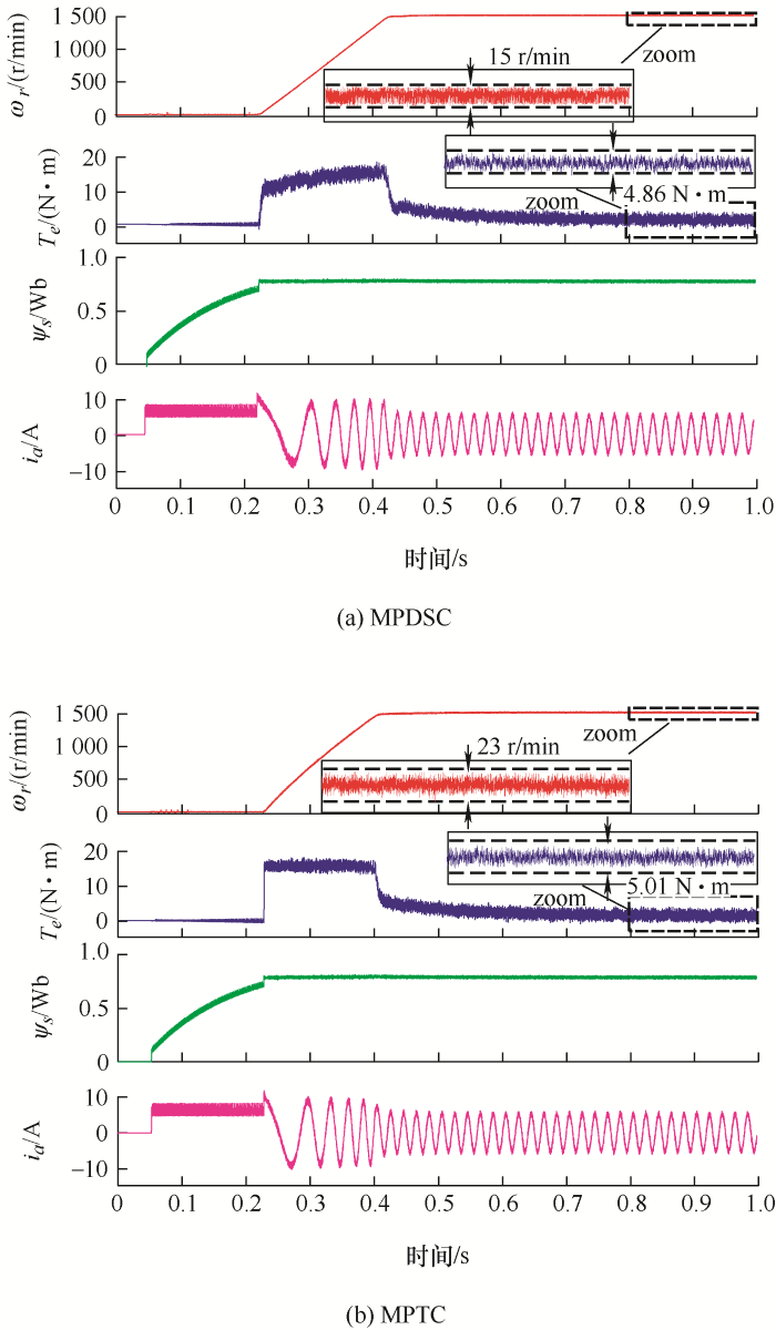图8 为两种方法控制电机运行在1 500 r/min时突加、突减额定负载试验。两种方法在负载转矩变化后电磁转矩也随之迅速变化。由图8 可以看出,MPDSC转速脉动小于MPTC,在突加、突减负载后转速也能更快恢复到指令值。