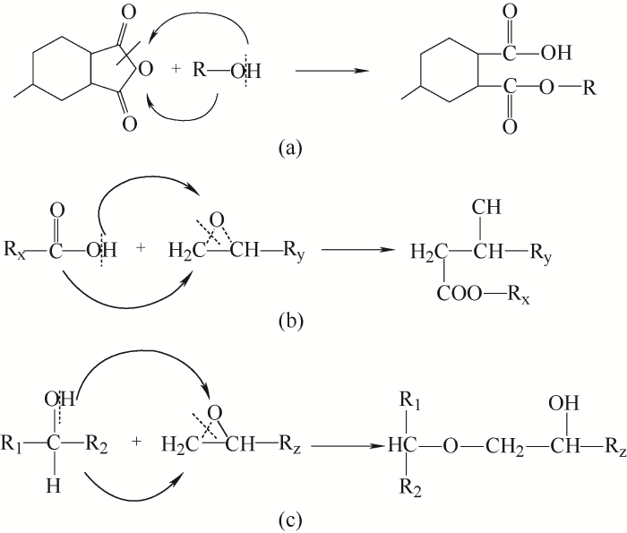 除了必需的环氧树脂基体与固化剂,针对不同的应用场景与性能要求,助剂也同样不可或缺,如促进剂、稀释剂、偶联剂等。促进剂常常与高温下才能发生反应的固化剂混合使用,目的是提升反应活性,降低固化温度,缩短反应时间[37]。酸酐固化剂与环氧树脂基体常温下反应活性极低,通常在200 ℃以上才会发生反应[38]。几乎所有的酸酐固化过程都需要配合促进剂使用。促进剂根据催化原理可分为亲核型促进剂、亲电型促进剂和金属羧酸盐促进剂。亲核型促进剂一般为路易斯碱,对环氧/酸酐固化体系具有双重的催化作用,既可以催化环氧交联,又可以催化酸酐开环。其过程为一般先生成烷氧阴离子与酸酐反应,接着生成羧基阴离子与环氧反应,进而生成新的烷氧阴离子,反应交替进行最终形成聚酯交联结构。路易斯碱的碱性越强,取代基的空间位阻越小,催化活性越大。亲电型促进剂一般为路易斯酸及其络合物。这类有机酸、醇或酚的催化原理为先经过络合态进而形成固化交联结构。有些路易斯酸在室温下与环氧树脂和固化剂结合性质稳定,在高温下才会加速反应,起到催化作用,具备潜伏型促进剂的特点。金属羧酸盐中的金属离子在反应前期有空轨道,能与环氧基形成络合物实现催化聚合反应;后期随着反应的放热效应,金属羧酸盐解离成羧酸阴离子实现催化聚合反应。两种不同的催化机理使得固化产物中既有酯基又有醚键。促进剂与环氧/酸酐体系的匹配对于提升环氧树脂的产物性能具有重要意义[14]。