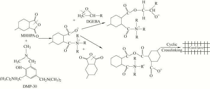常见的酸酐固化剂可分为芳香族酸酐、脂环族酸酐、脂肪族酸酐等,其中甲基六氢邻苯二甲酸酐(Methyl hexahydrophthalic anhydride, MHHPA)是电工领域常用的脂环族酸酐固化剂。它具有熔点低、相容性好、黏度低、适用期长、固化物耐热性高、高温绝缘性能优异,常用于电气设备绝缘芯子的浸渍、支撑部件的浇注和功率器件的密封等场景[36]。