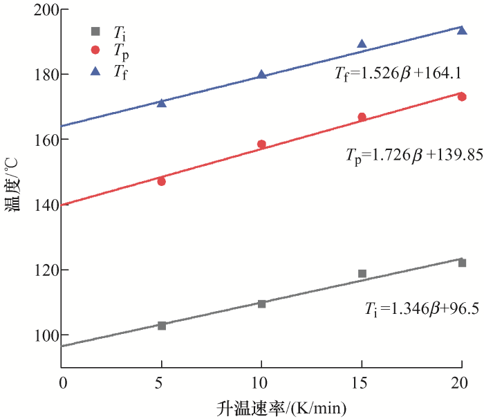 通过DSC测试得到的热流曲线能够反映热流速率随时间的变化关系(dH/dt-t),进一步分析可以获得环氧树脂/酸酐体系的固化特征温度,包括峰始温度、峰值温度和峰终温度。一般认为,峰始温度对应体系开始发生反应的温度,峰值温度对应反应最为剧烈的温度。在实际固化工艺流程中,为了防止初始反应太快,反应放热太剧烈引起局部温度集中和明显的热应力,固化方案先采用较低温度固化一段时间,而后提高温度使反应加快以完成固化[61]。两段固化成为通用的环氧树脂固化方案,前固化温度一般在初始反应温度附近选择,后固化温度一般选择峰值温度。在实际的固化过程中,环氧树脂在特定的温度下进行固化,即升温速度为0 K/min。因此,对不同升温速率下反应的特征温度进行线性拟合,可以外推获得升温速率为0 K/min时的特征温度,即温度外推法。图4为根据DGEBA/MHHPA/ DMP30体系不同升温速率下DSC热流曲线特征温度的外推拟合结果,可以确定该体系前固化温度为100 ℃,后固化温度为140 ℃[14]。