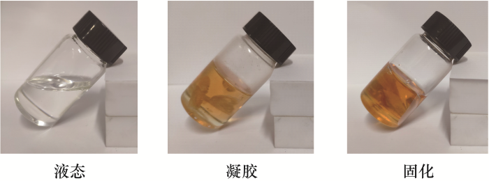 固化度通常定义为环氧树脂中已交联的环氧基与所有的环氧基之比,也可以定义为反应已经释放的热量与反应总的放热量之比,它是衡量环氧树脂反应进程的重要指标[45,62]。环氧树脂交联过程中体系形态的变化大致可划分为液态-凝胶-固态的不同阶段,如图5所示。在凝胶点之前,环氧树脂体系大致呈液体状态,流动性较强,体系各处的分子均可以发生有效碰撞引发交联反应,反应主要受体系浓度控制,在这一过程中要完成关键部件的浸渍、灌封等,因此要准确获取这个阶段所能够持续的时间;凝胶点之后,环氧树脂体系呈凝胶状态,流动性减弱,之前浓度较高的部分反应完全,浓度较低的部分需要高浓度处剩余的未反应物扩散到低浓度处才能发生反应,交联反应取决于未反应部分的流动能力,反应主要受体系扩散控制,这一过程是完成预定固化度的关键期,也是预防填料沉降、提高耐热、优化强度与韧性的关键期[14]。