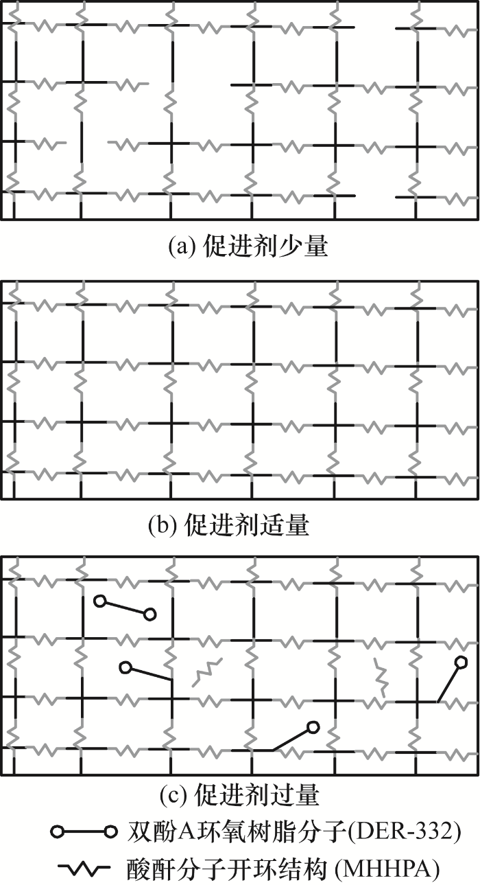 促进剂比例对固化产物的影响相比前者尚未得到充分关注。AMIROVA等[70]研究了膦盐催化的环氧/酸酐体系的热性能,确定3wt%~4wt%为膦盐促进剂的最佳比例,有利于形成缺陷最少的三维交联网络。GOU等[71]开发了一种封装三苯基膦(TPP)的环氧/酸酐体系潜伏促进剂,该促进剂基于有机-无机杂化机理提高了环氧热固性树脂的玻璃态转化温度,同时具有增韧效果。杨威等[54]采用DSC对高压绝缘拉杆用环氧树脂体系进行固化动力学分析,验证了促进剂通过降低活化能可使固化温度显著下降,同时发现当促进剂用量为0.5%时,固化产物Tg达到最高值106.3 ℃。然而这些研究多集中关注环氧树脂的热学性能与机械性能,对绝缘性能的研究较少。LI等[43]在保证环氧树脂充分交联的经验固化工艺下,确定添加0.5% DMP-30时环氧树脂-酸酐体系绝缘性能达到最优,主要是对介电性能的影响较为明显,少量与过量的促进剂作用下其交联网络结构不佳,如图6所示,分析认为环氧树脂固化产物能带间隙的增大是电导率升高的重要原因。