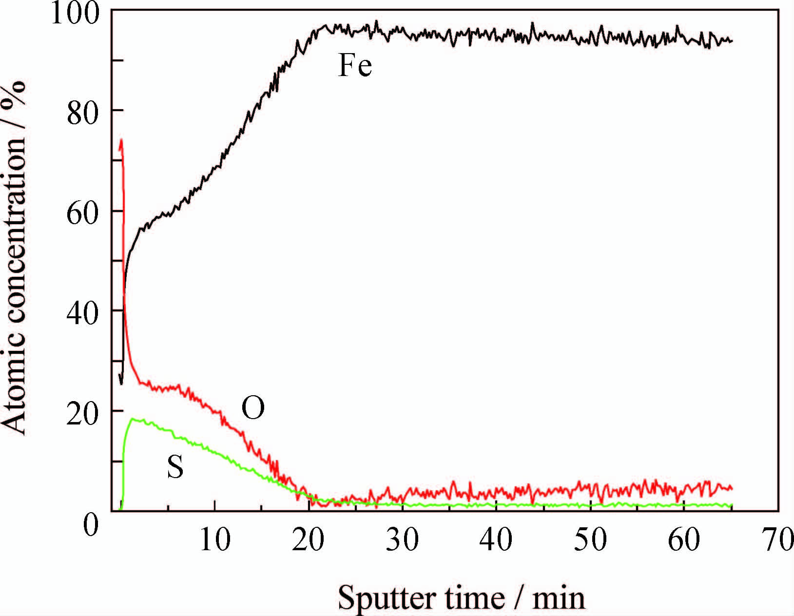 图 5为渗硫层表面某些元素深度剖析的AES结果,在溅射时间65 min内,Fe元素含量由表层到内层逐渐增加并趋于稳定,S元素含量先突然增加,然后逐渐减少至一稳定值,而O元素含量则逐渐减少至一稳定值。表层Fe含量少,是因溅射所致,而近基体Fe含量多,是因为基体与熔覆层有一定的稀释率,使得基体中的Fe元素溶解进入熔覆层;S元素含量的突然增加是因为最表层S元素的沉积所致,而随后的含量减少是由于S元素沿晶界及缺陷扩散所致;O元素含量逐渐减少是因为外界对表面的氧化作用,越往内部基体,氧化越弱。在溅射时间范围内,S与Fe原子摩尔比始终小于1,且在2 min左右时接近1,之后S与Fe原子数比例越来越小,在20 min 时基本降低为0,这说明S元素在表面富S,沿着晶界向基体也有一定的扩散[7]。