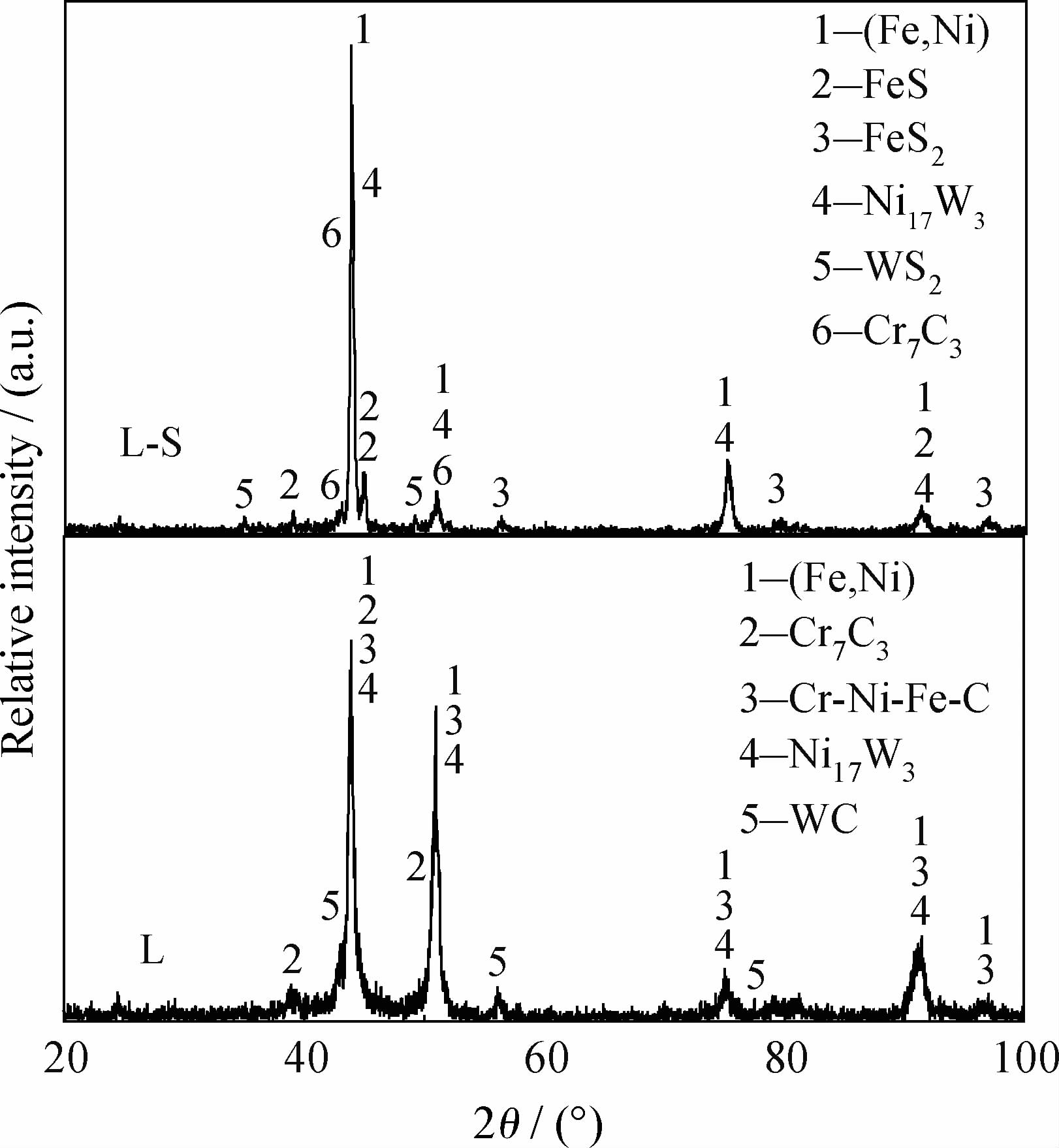 图 6为激光熔覆层(L)与渗硫层(L-S)X射线衍射测定的物相组成。可以看出,激光熔覆层的组成相主要有(Fe,Ni)固溶体、Cr23C6等,其中固溶体为熔覆层的主要成分。激光熔覆过程中,粉末中的Ni元素与基体中的Fe元素形成的铁镍固溶体,以及涂层中引入的碳化铬等碳化物颗粒均为涂层中的强化相,强化了激光熔覆层的硬度和耐磨性。其余相含量很少,几乎可以忽略不计,可见熔覆层的成分分布较为均匀[8]。