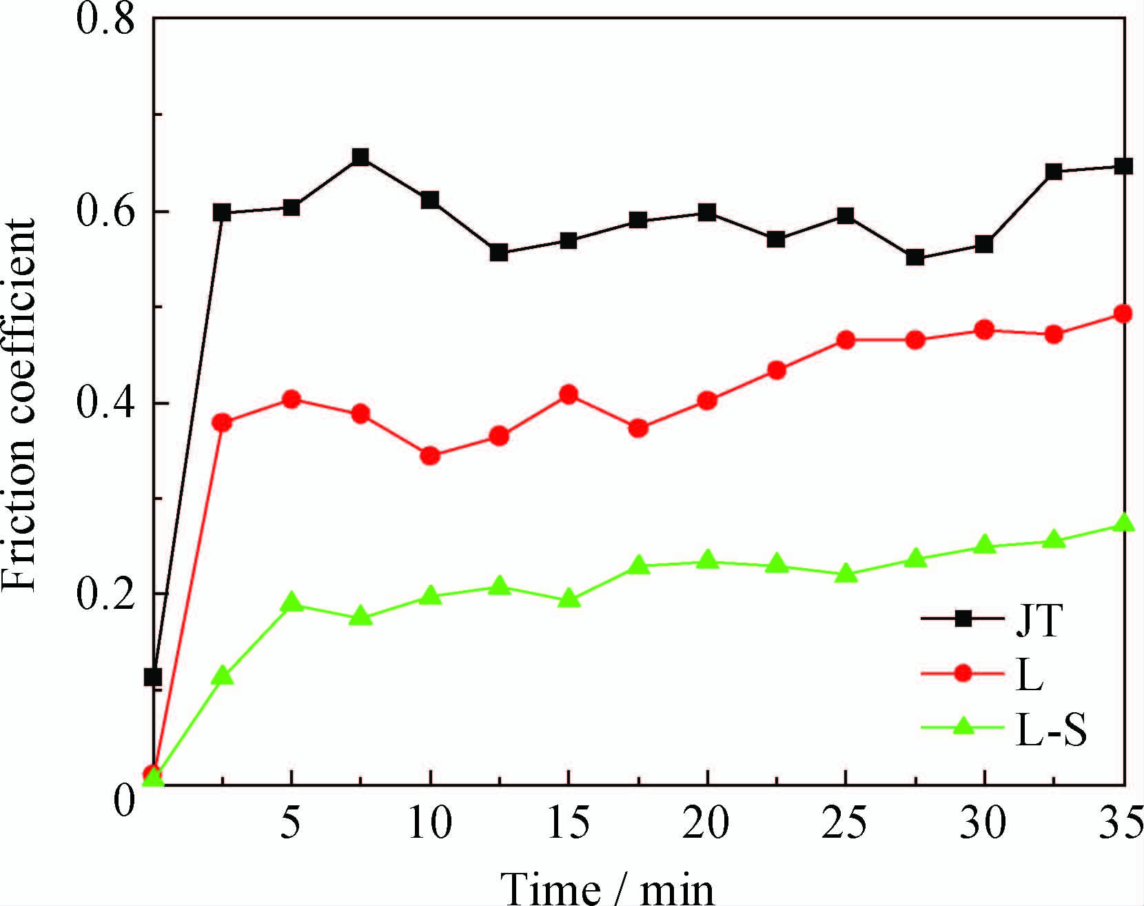图 7为基体45钢(JT)、熔覆层(L)和渗硫复合层(L-S)摩擦因数-时间曲线。