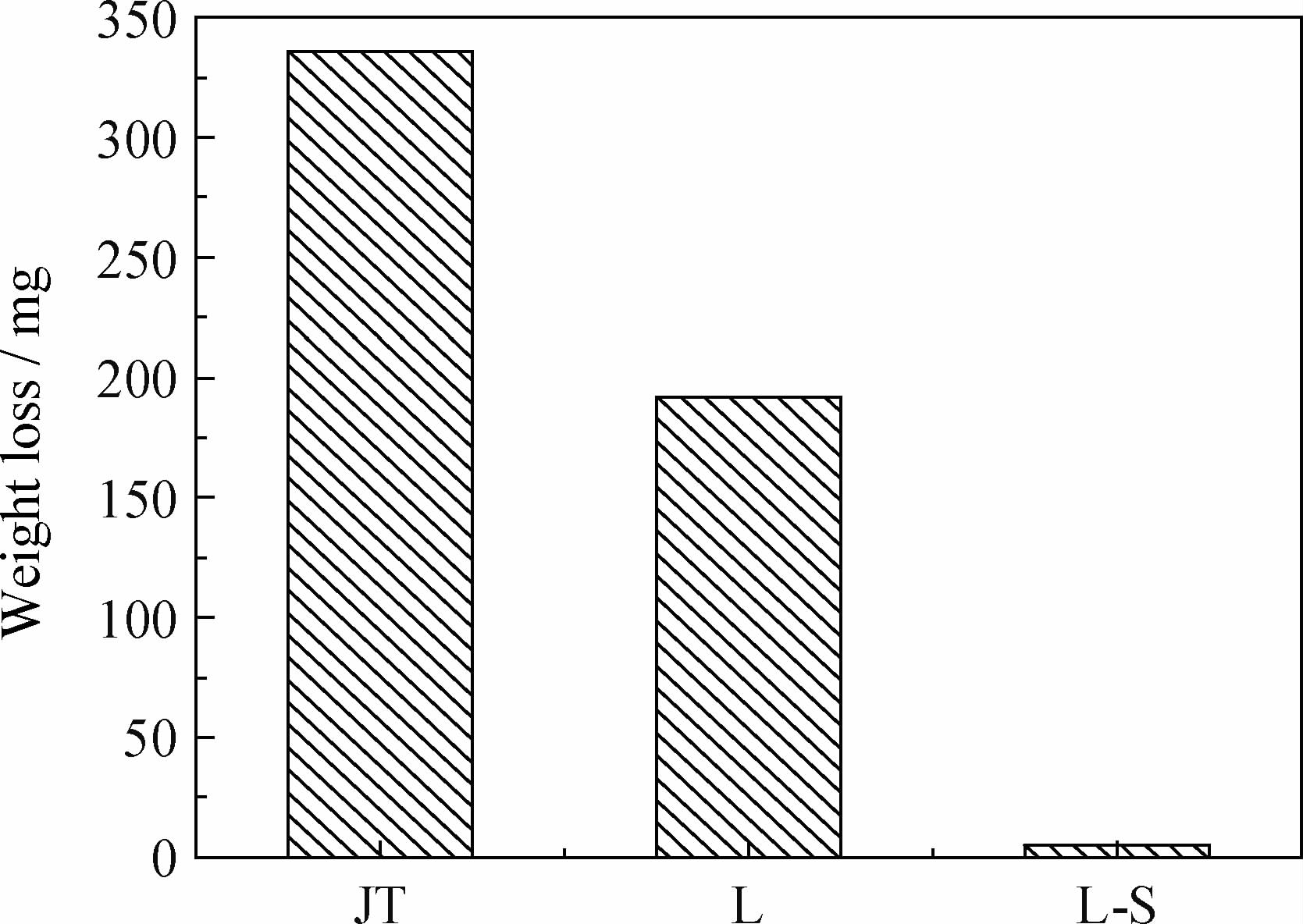 图 8为在相同摩擦条件下基体45钢(JT)、熔覆层(L)和渗硫复合层(L-S)磨损失重量对比柱形图。激光熔覆层的摩擦磨损失重量约为基材的40%,激光熔覆-渗硫层磨损失重量约为基材的0.3%。45钢原始试样的磨损量明显高于激光熔覆及激光熔覆-渗硫处理后试样的磨损量,其中激光熔覆-渗硫层的磨损失重量最小,即激光熔覆-渗硫层体现出了更好的耐磨性能。
